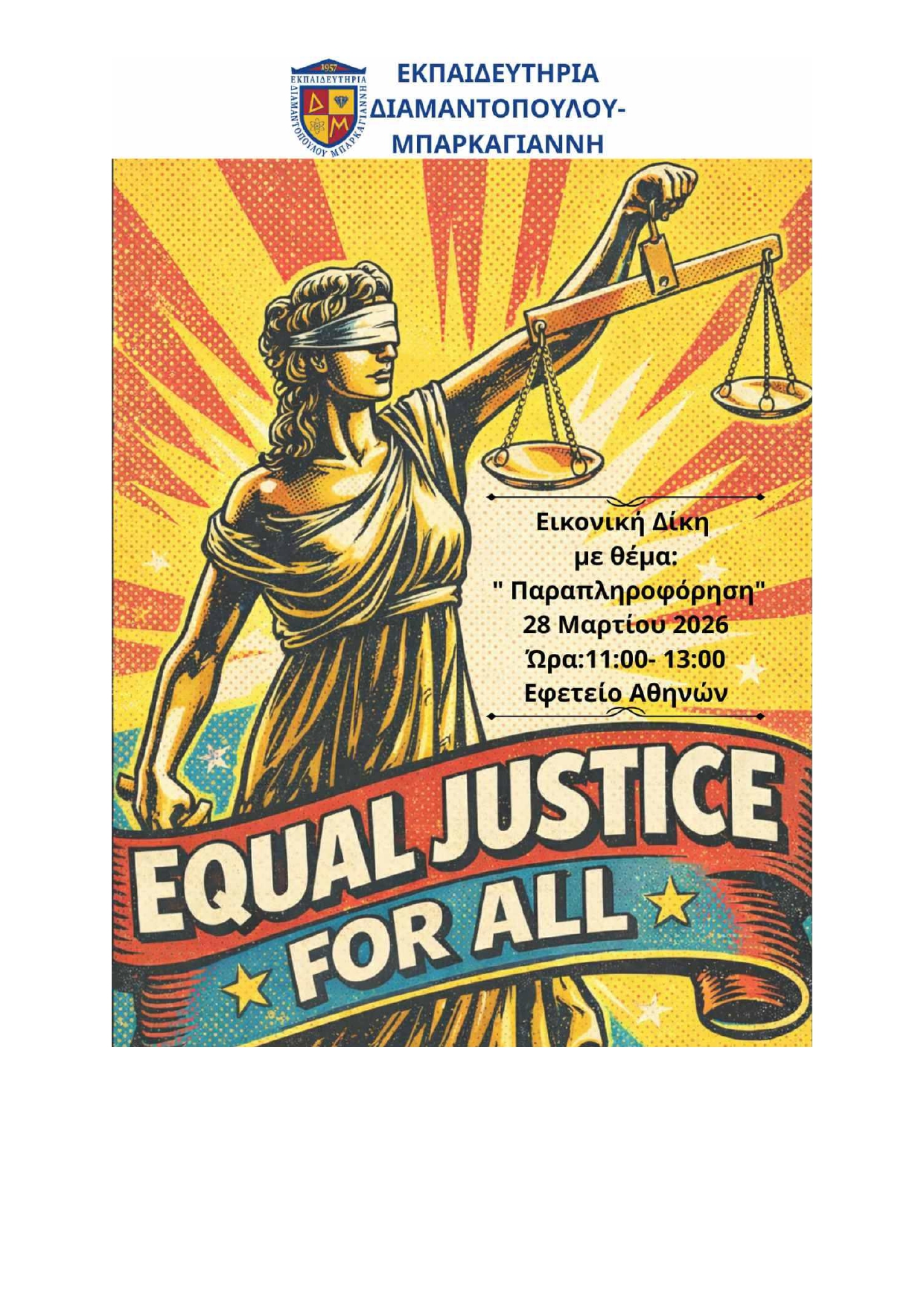 Η Διεύθυνση και οι μαθητές/-τριες του σχολείου μας έχουν την τιμή να σας προσκαλέσουν στην εικονική δίκη που διοργανώνεται στο πλαίσιο του προγράμματος EPAS «Σχολεία Πρέσβεις του Ευρωπαϊκού Κοινοβουλίου»